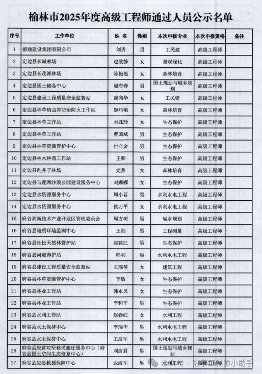2025年10月26日,榆林市人社局正式发布《关于2025年度榆林市工程系列高级工程师评审结果的公示》,共有193名专业技术人员通过评审,涵盖能源化工、土木工程、交通工程、生态保护、国土规划、风景园林等核心领域。此次公示不仅标志着榆林市工程技术人才队伍的进一步壮大,更体现了职称评审“公平、公正、公开”的原则,为区域产业升级注入新动能。下面我们一起来看一下公示人员名单吧!